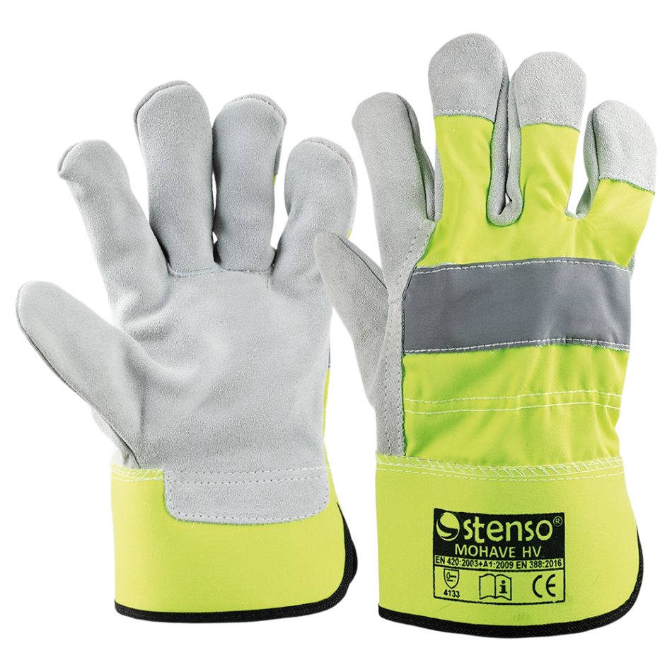 Работни ръкавици с висока видимост, изработени от цепена телешка кожа и плат, подсилена длан. 4 см. светлоотразителна лента.