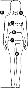 Размер А (Гръдна обиколка) В (Талия) C (Ханш) D (Крачол) E (Височина)