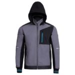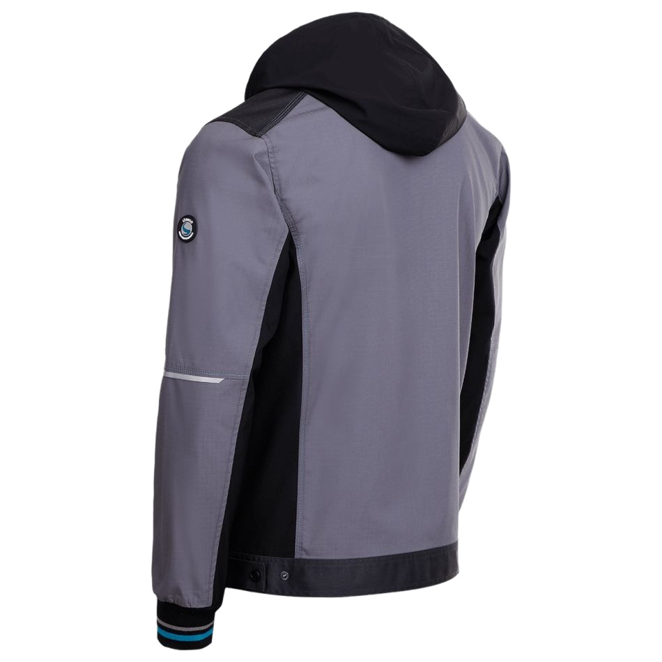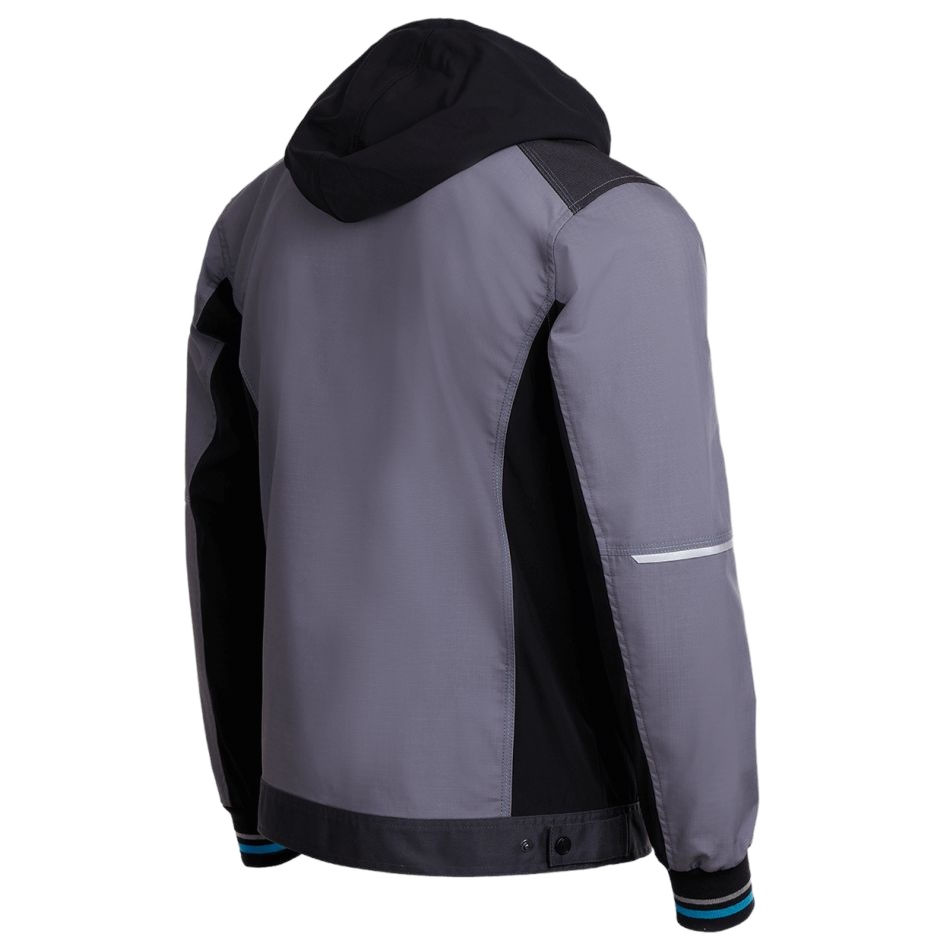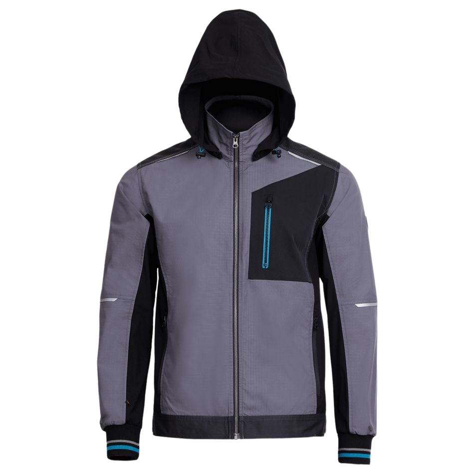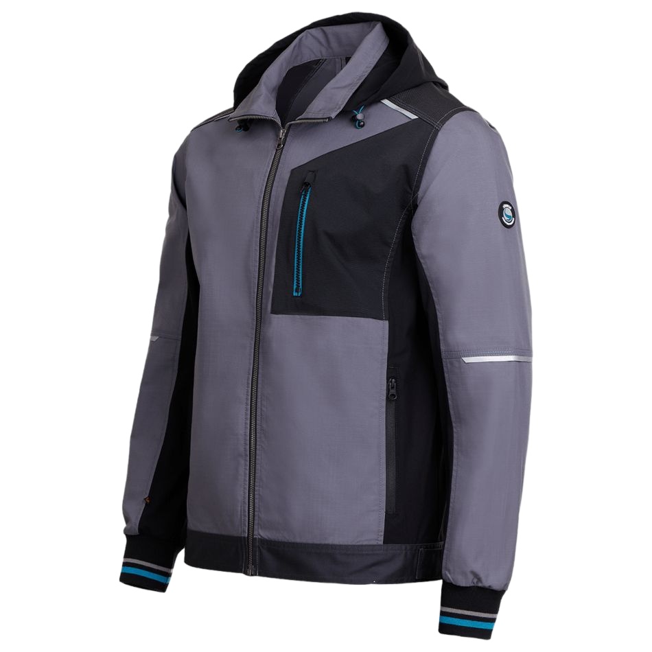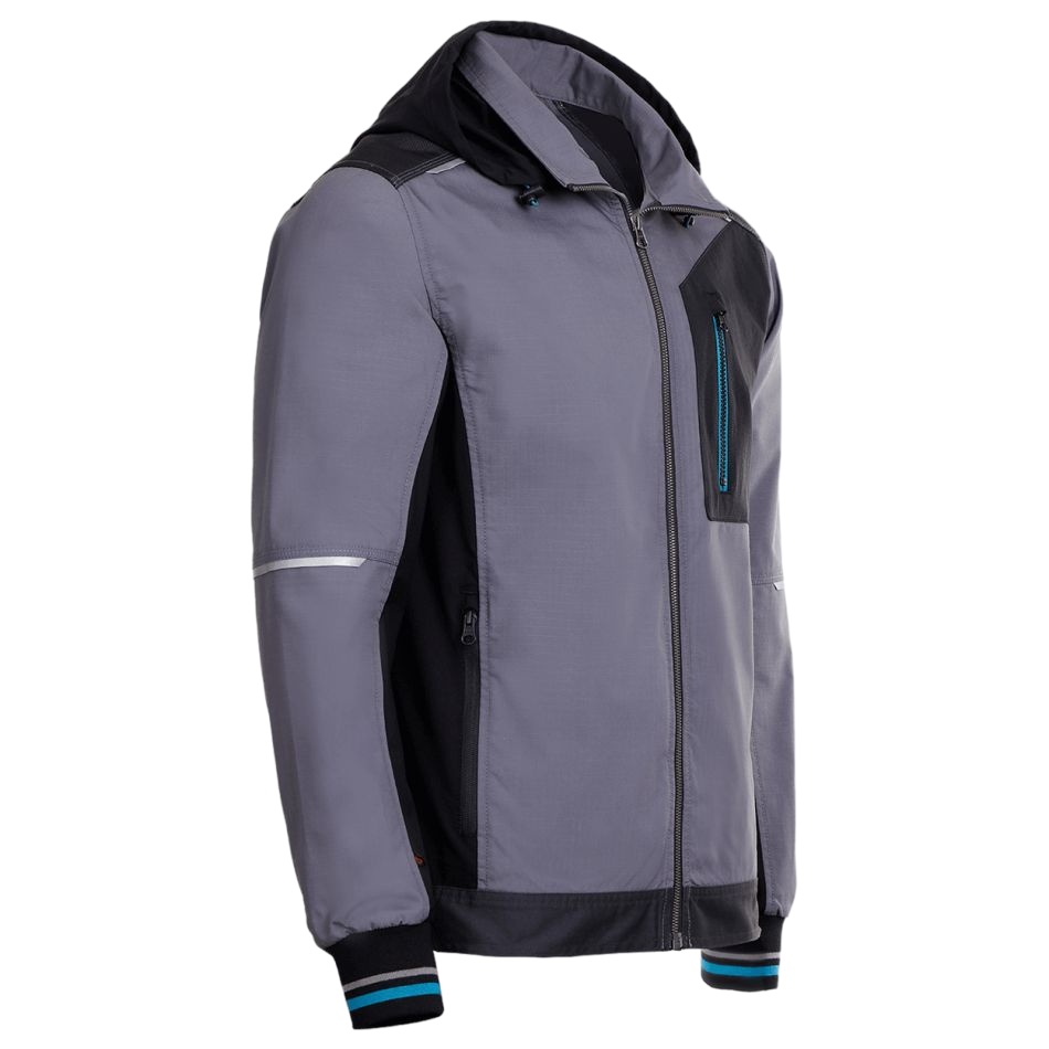Модерно работно яке в комбинация от Ripstop и еластични платове, със сваляща се качулка.