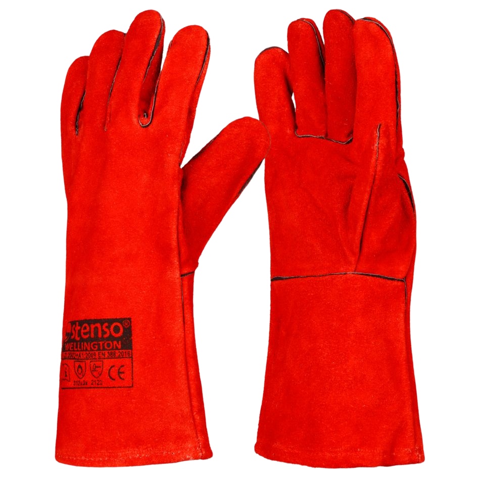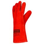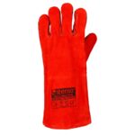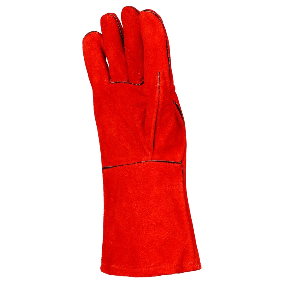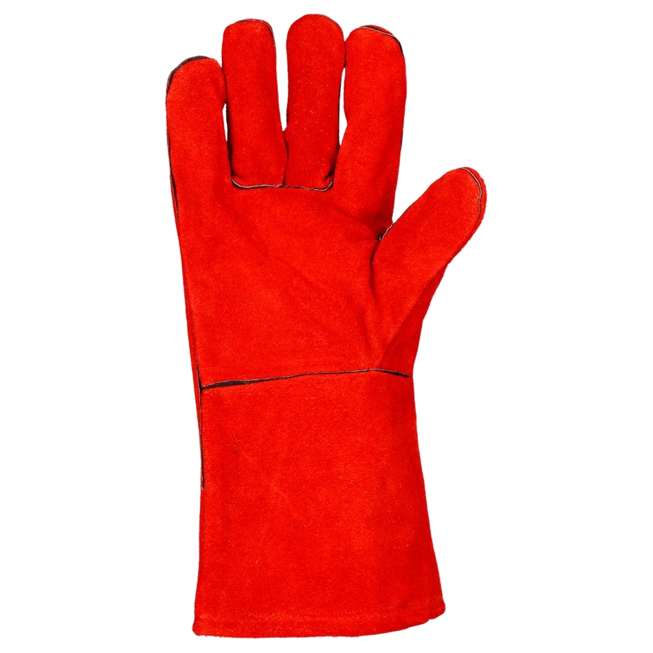 Ръкавици за заварчици тип А с пет пръста, изработени от цепена телешка кожа с памучна подплата, подсилени в областта на дланта, скрити шевове