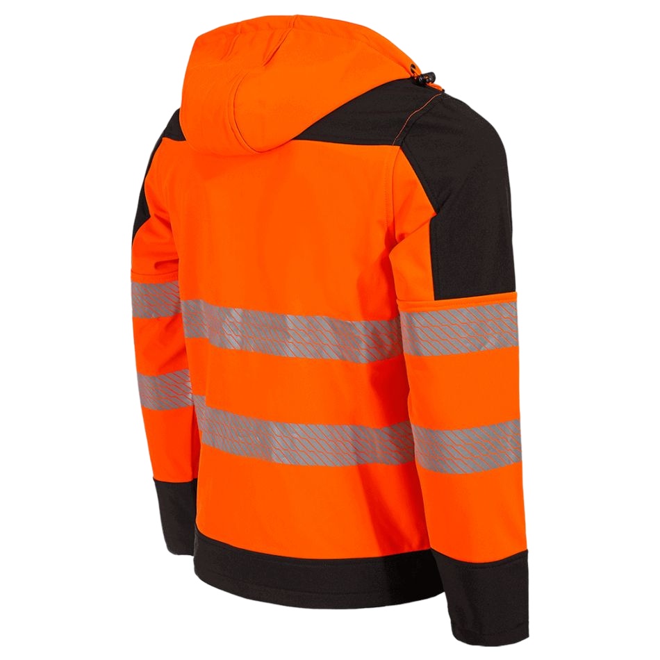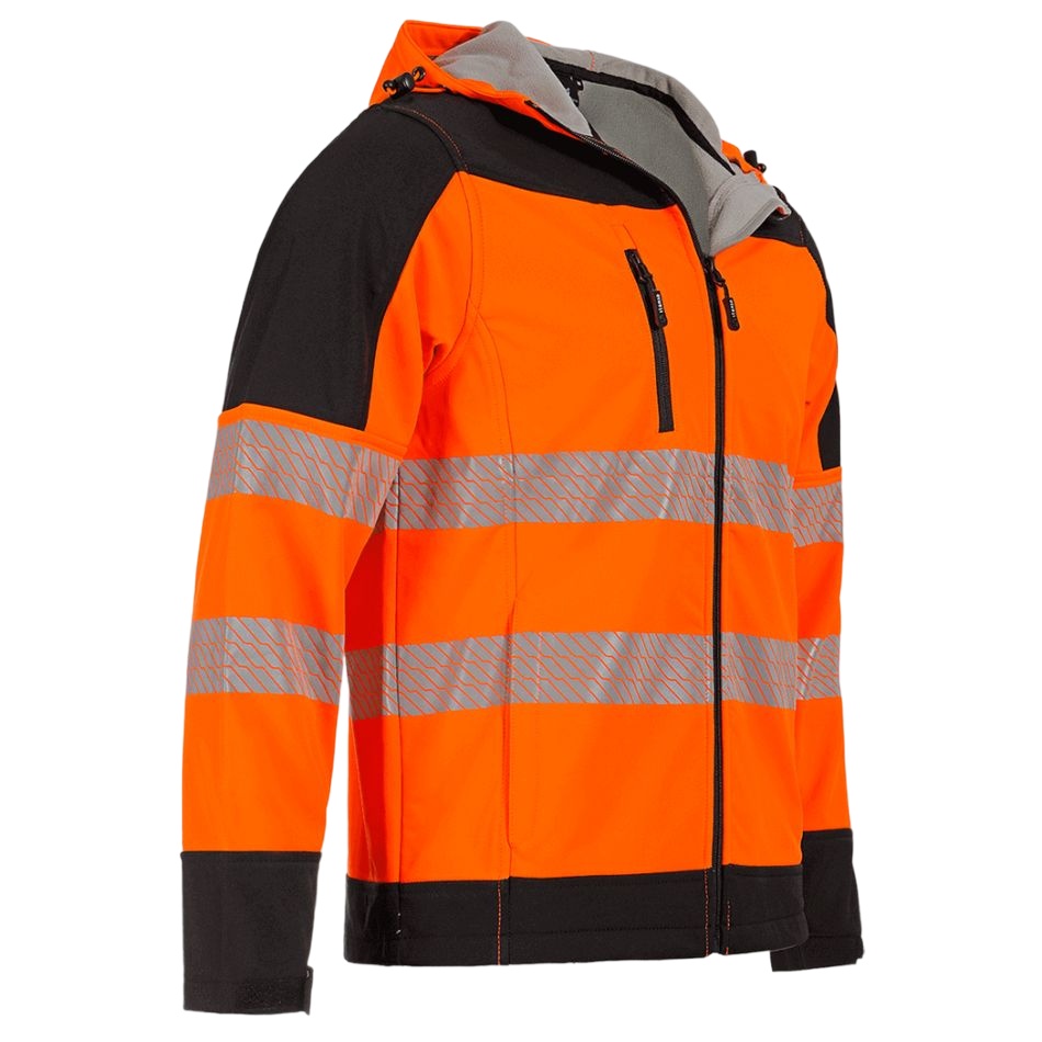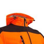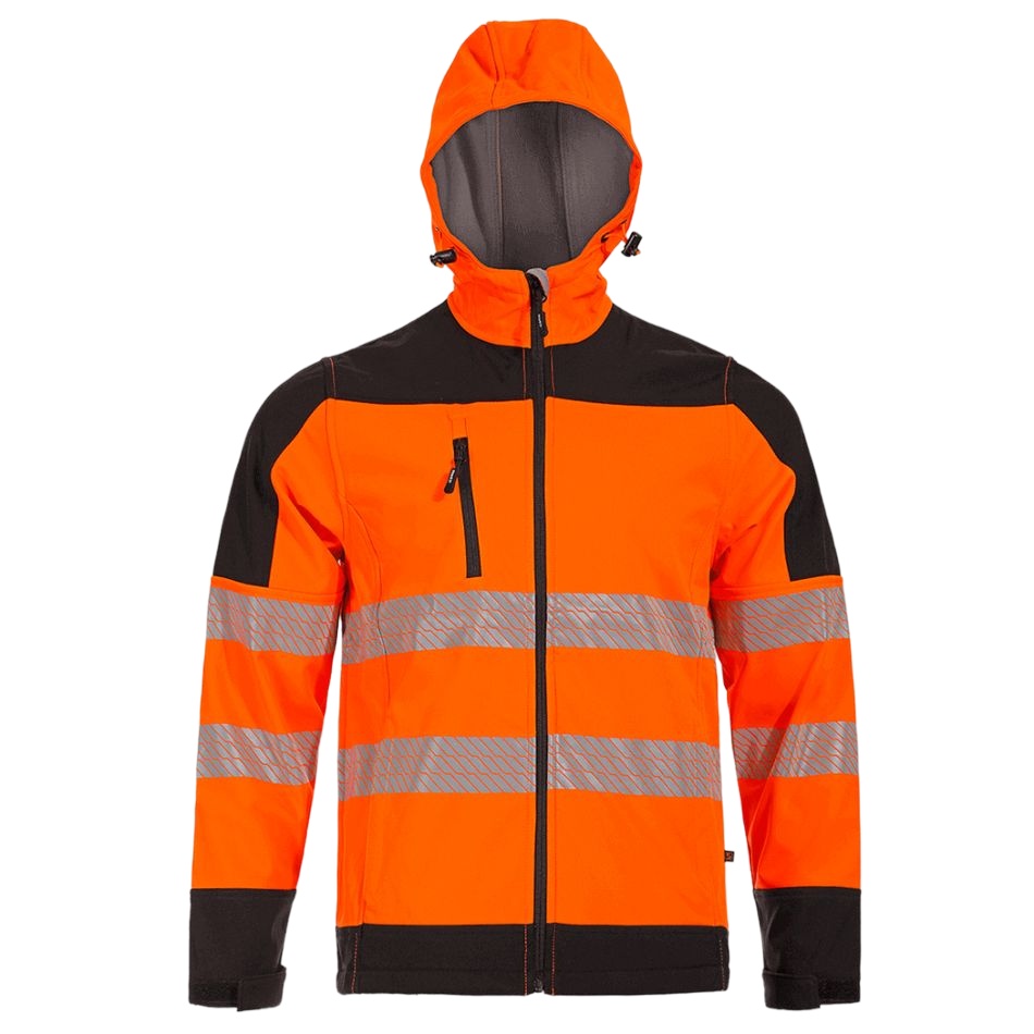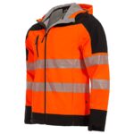 Сигнално софтшел яке с качулка и светлоотразителни ленти на ръкавите и торса, осигуряващи висока видимост и безопасност.