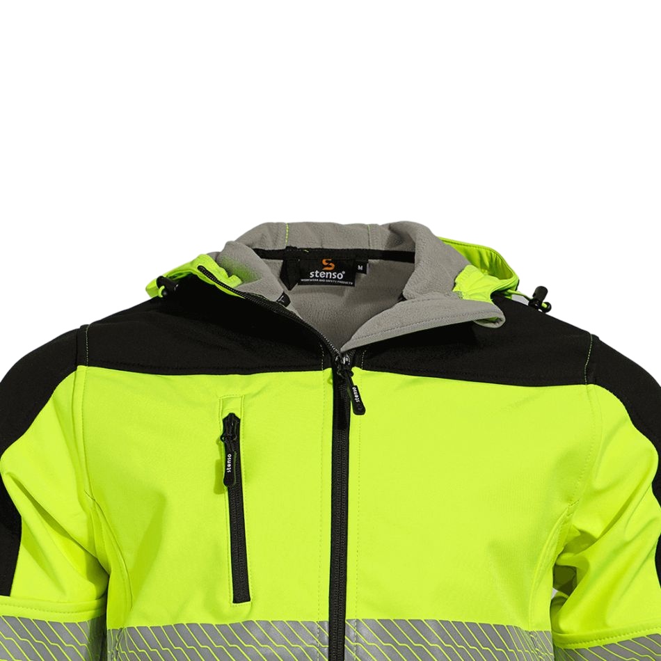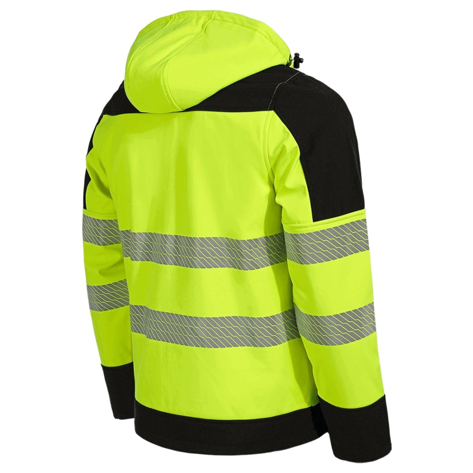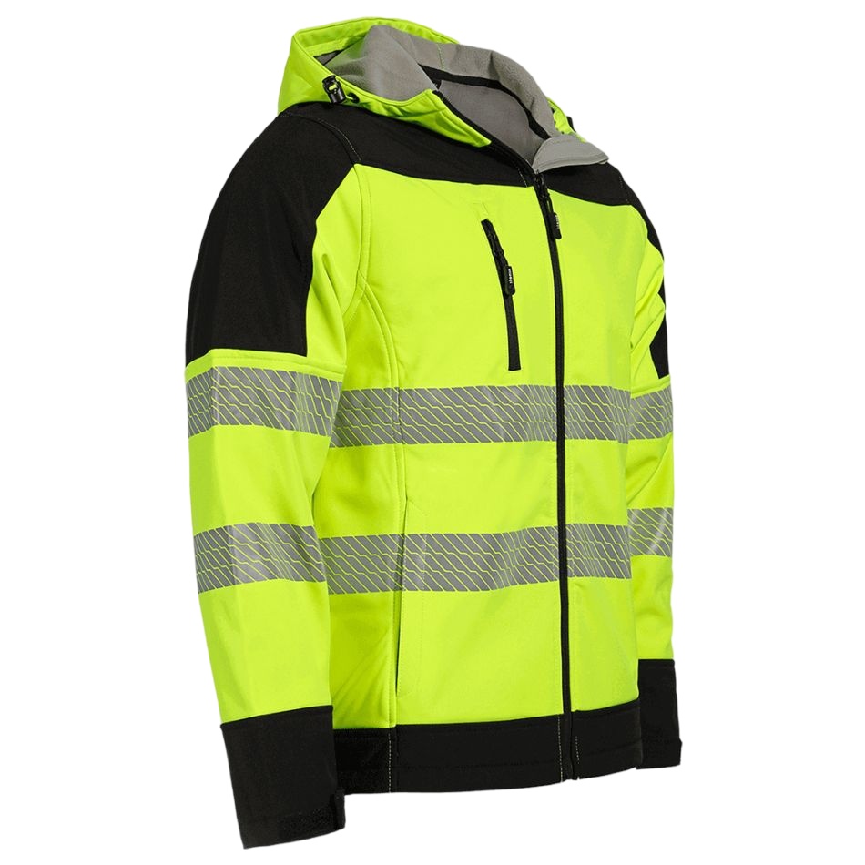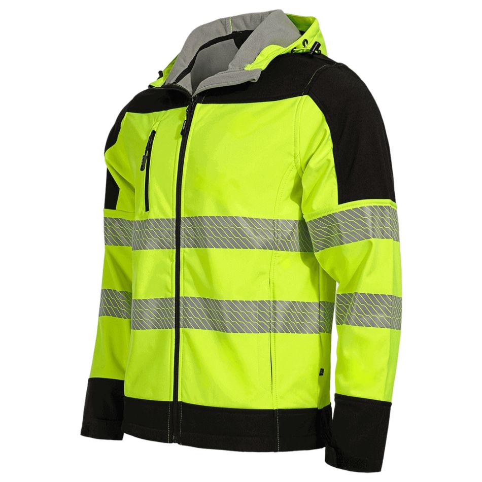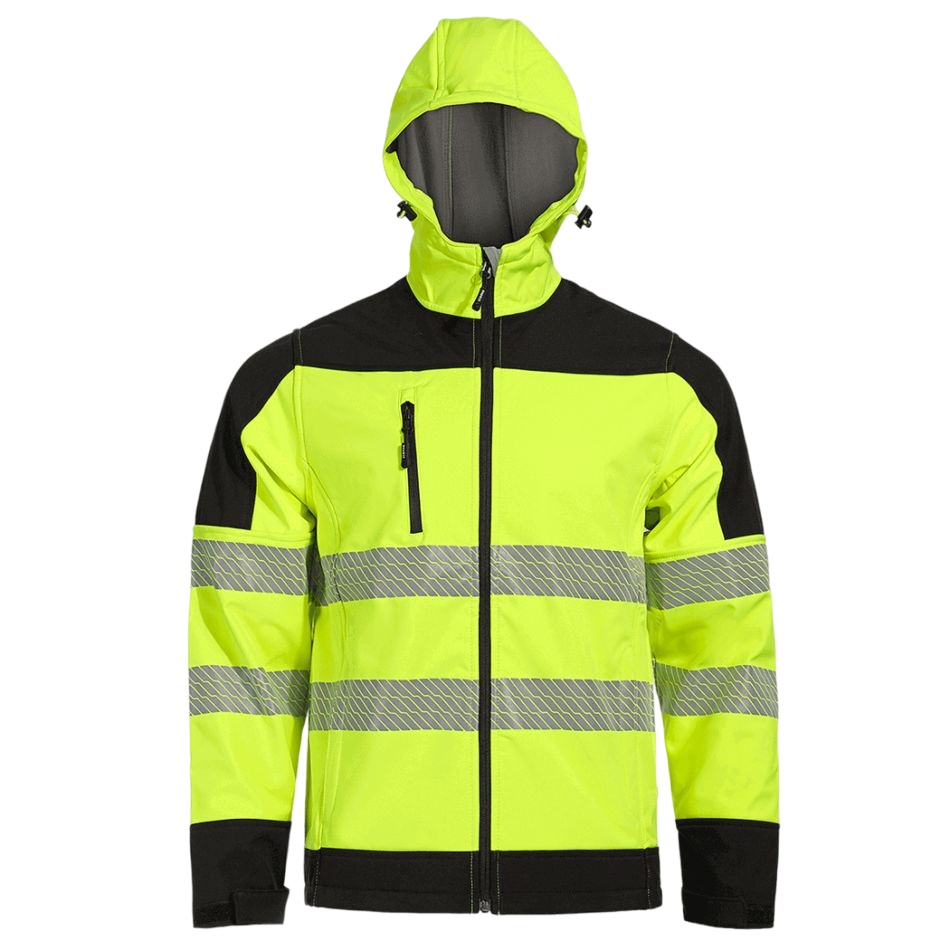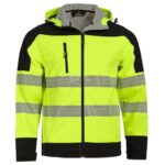 Сигнално софтшел яке с качулка и светлоотразителни ленти на ръкавите и торса, осигуряващи висока видимост и безопасност.