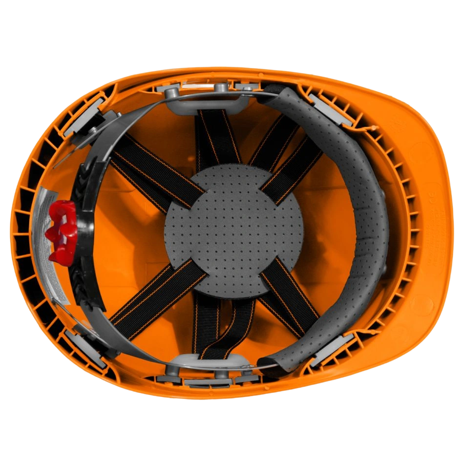Вентилирана защитна каска с 4-точков подбрадник, корпусът е изработен от ABS материал, оборудвана с 6 отвора за вентилация.