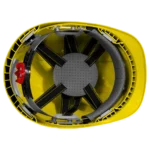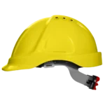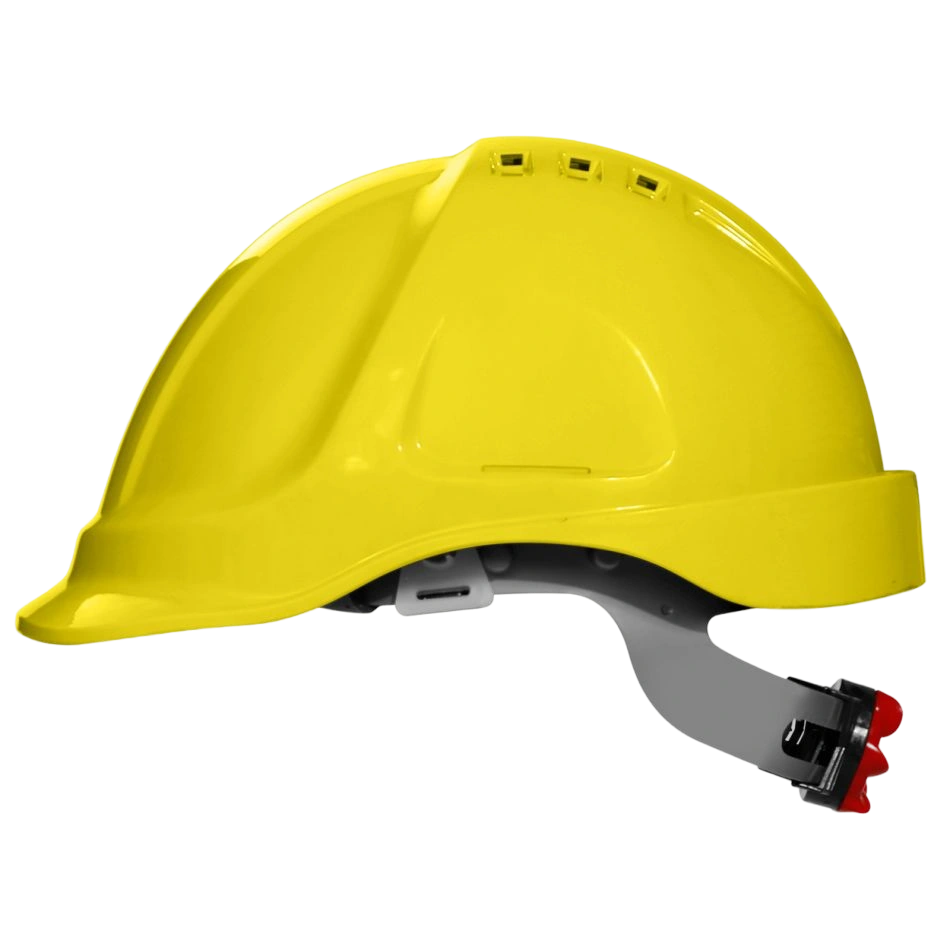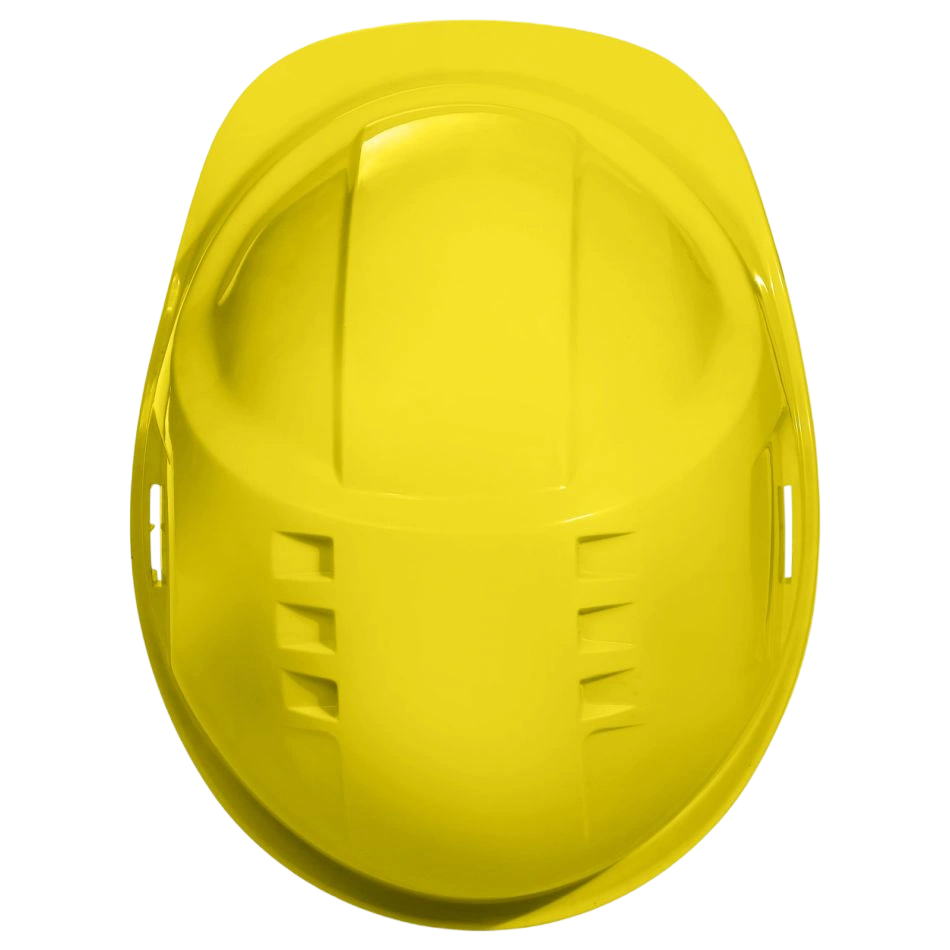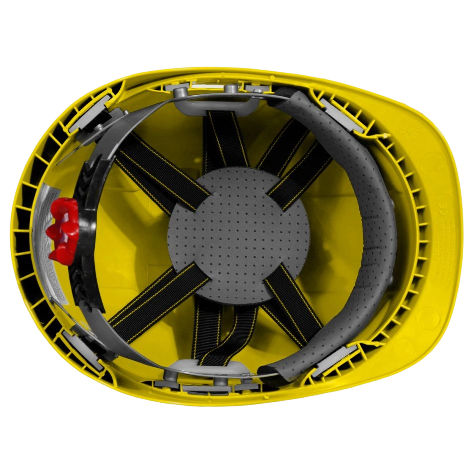 Вентилирана защитна каска с 4-точков подбрадник, корпусът е изработен от ABS материал, оборудвана с 6 отвора за вентилация.